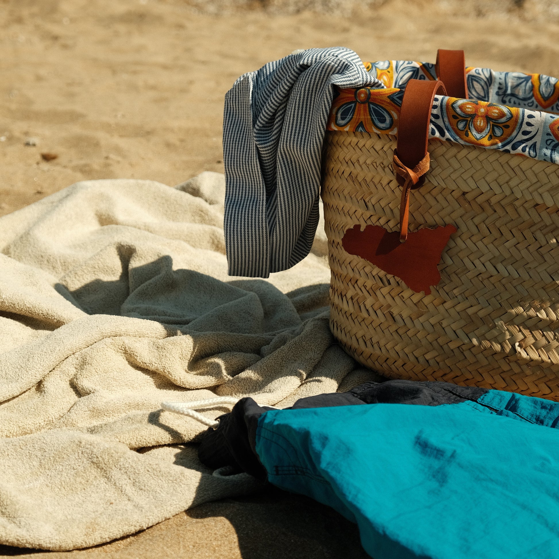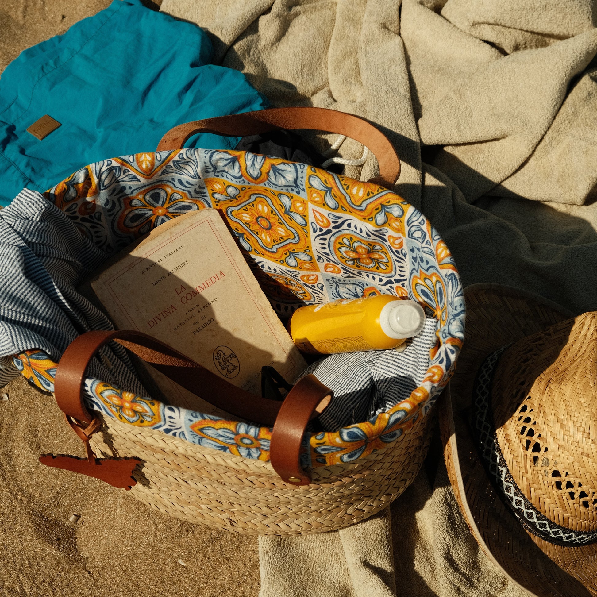 Rivestita internamente con tessuti vivaci e dotata di manici in pelle morbida per una presa comoda, diventa la compagna perfetta sotto il sole, capiente e pratica.