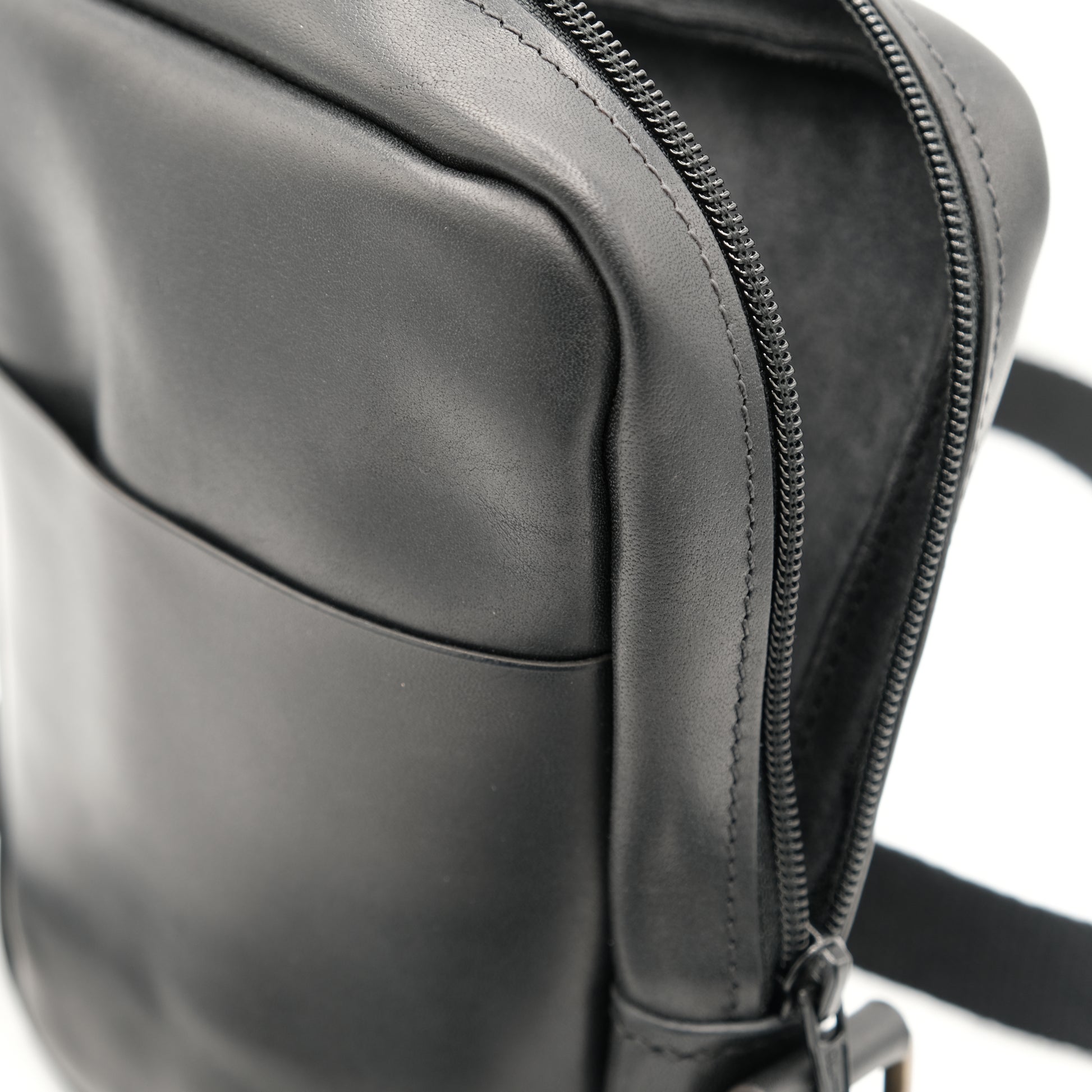 Presenta una tasca frontale esterna e una tasca centrale con chiusura a zip asimmetrica. Infatti l'apertura su un lato si estende maggiormente rispetto all'altro, rendendo più comodo raggiungere anche la parte bassa del borsello.