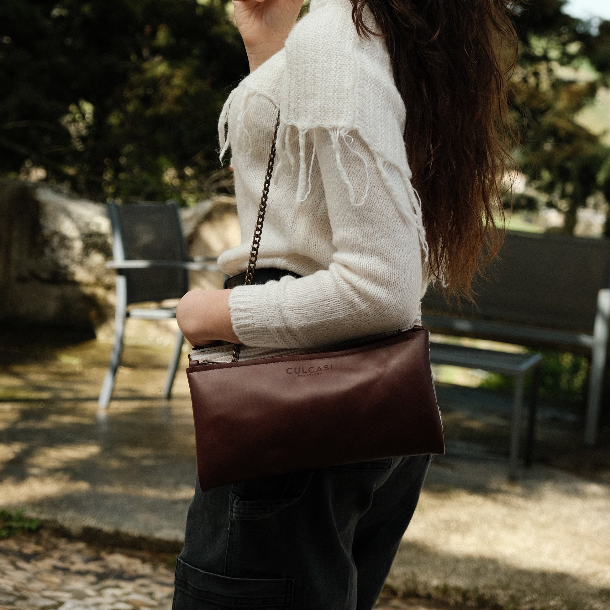 Inoltre può essere usata sia a mano, trasformandola in pochette, sia con l'utilizzo di una sottile catena regolabile da una misura massima di 120cm a una minima di 60, rendendo la borsa estremamente versatile e ideale per tutte le occasioni